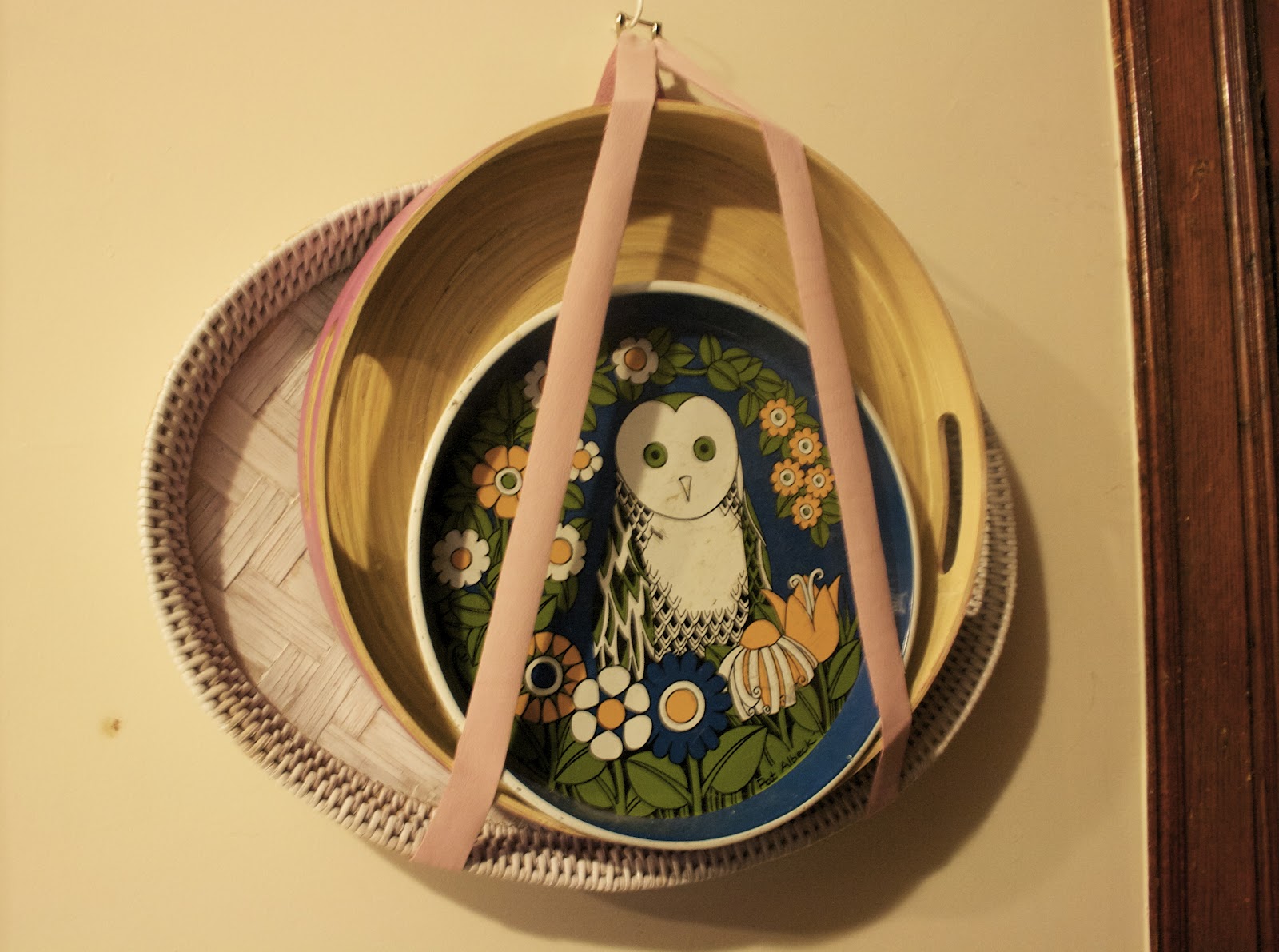 In the sixties everyone used these and I needed one. I used some strips of left over leather and an old metal ring & sewed it up! It makes my tray obsession a little more manageable & displays them in our kitchen. Kills two birds with one stone. Woo.